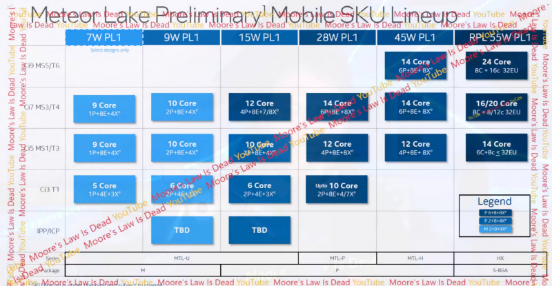 - Meteor Lake с номинальным TDP 7 Вт и количеством ядер от 5 до 9 (в максимальной конфигурации ядер 1P + 8E);